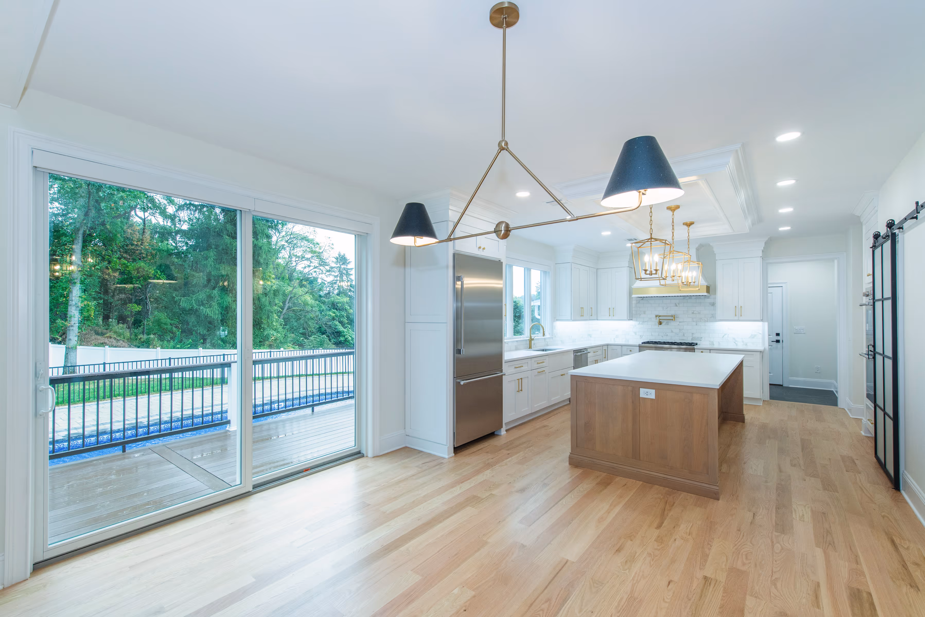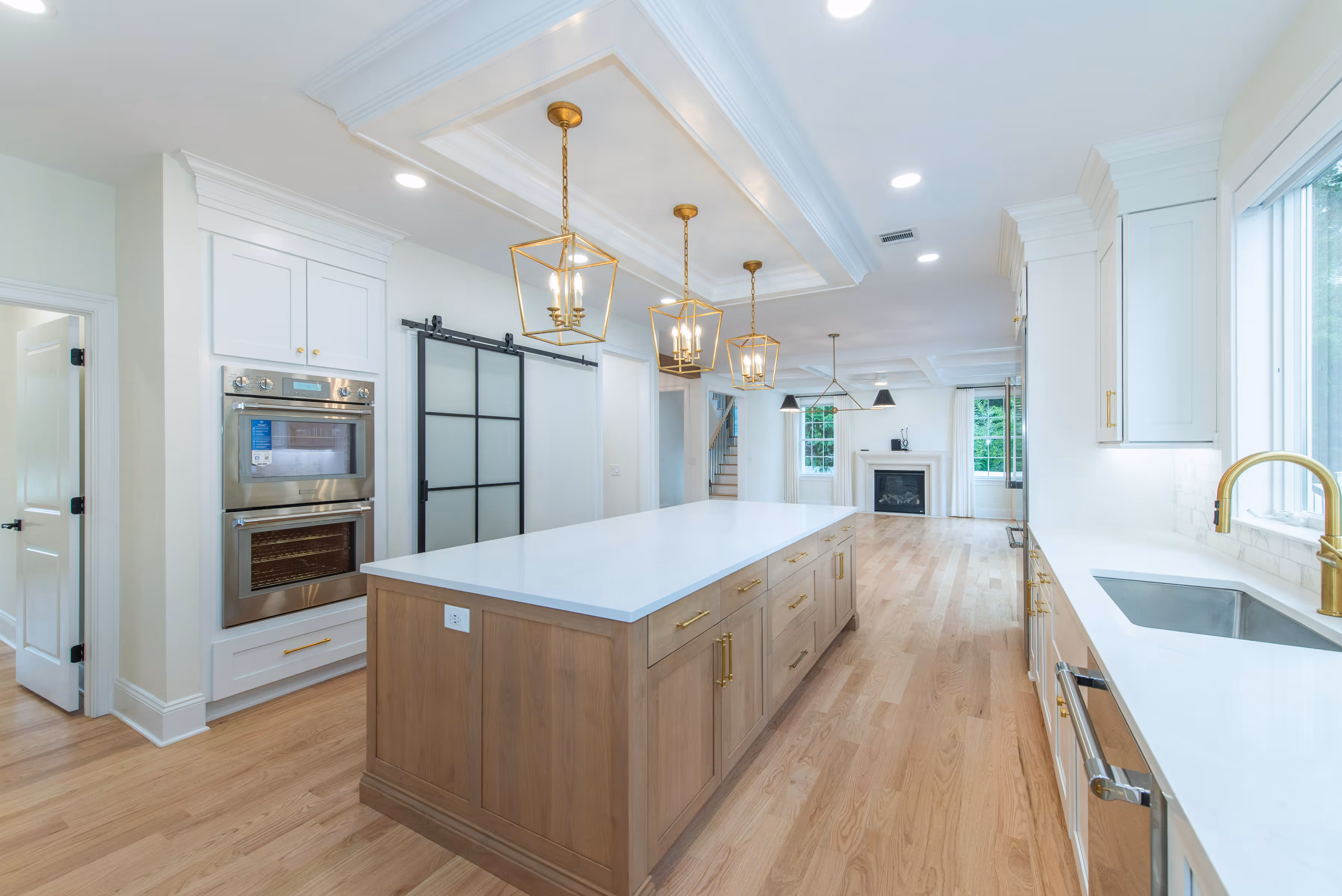 This custom kitchen is a timeless expression of soft luxury and refined craftsmanship. From the golden hardware to the warm wood island, every detail was thoughtfully designed to balance modern functionality with a classic feel. Oversized windows, white cabinetry, and tailored millwork create an open, inviting atmosphere; perfectly suited for both everyday living and elevated entertaining.