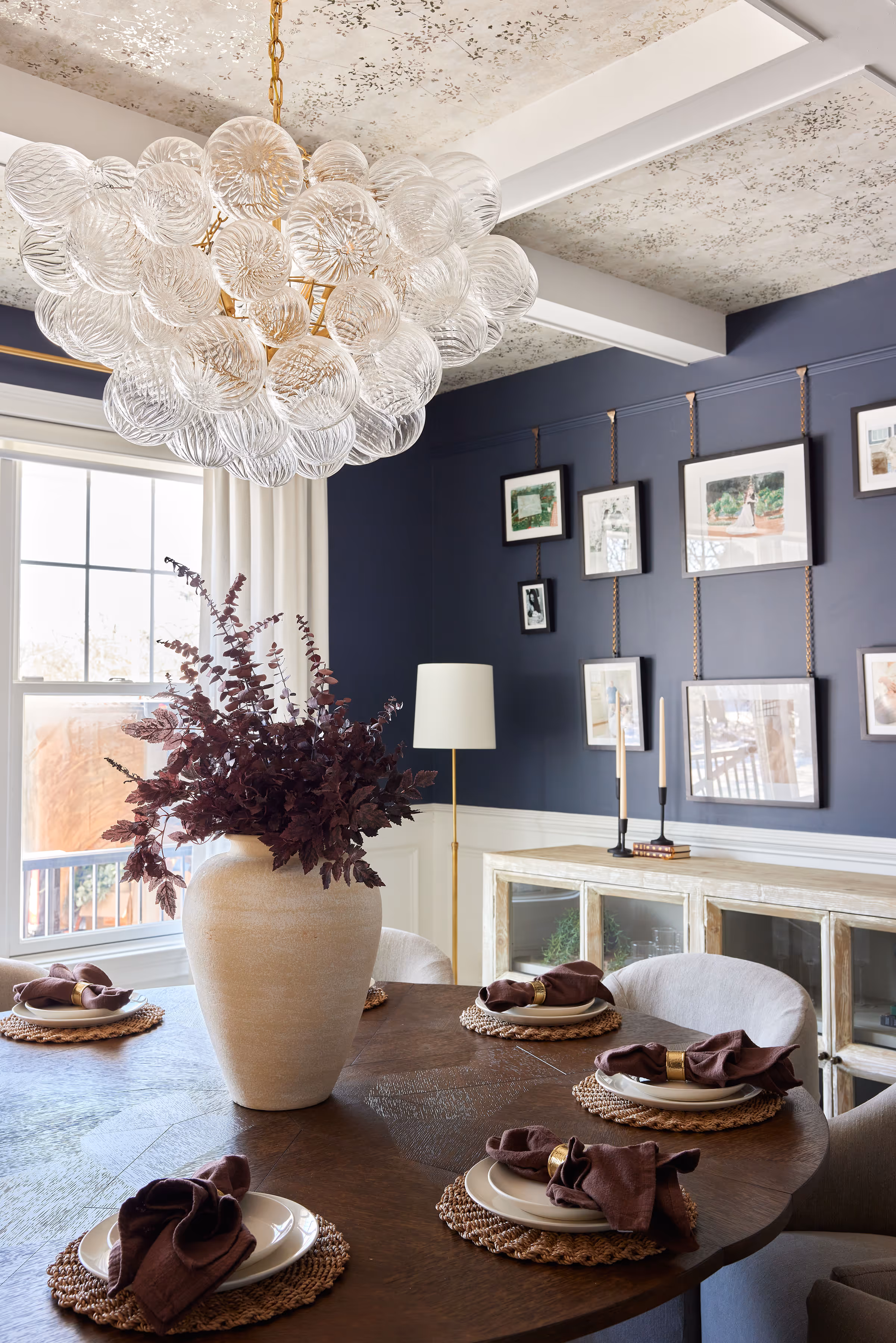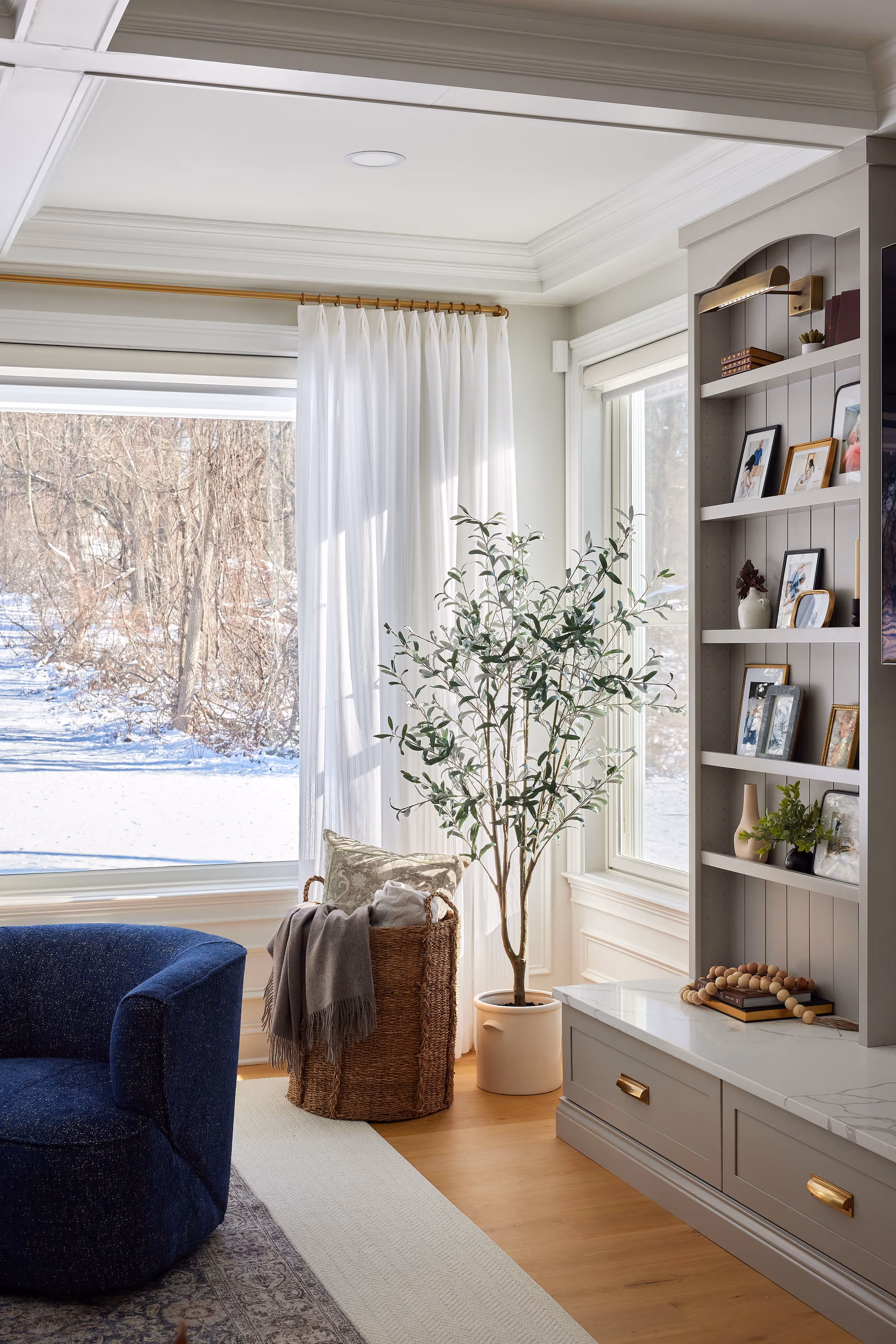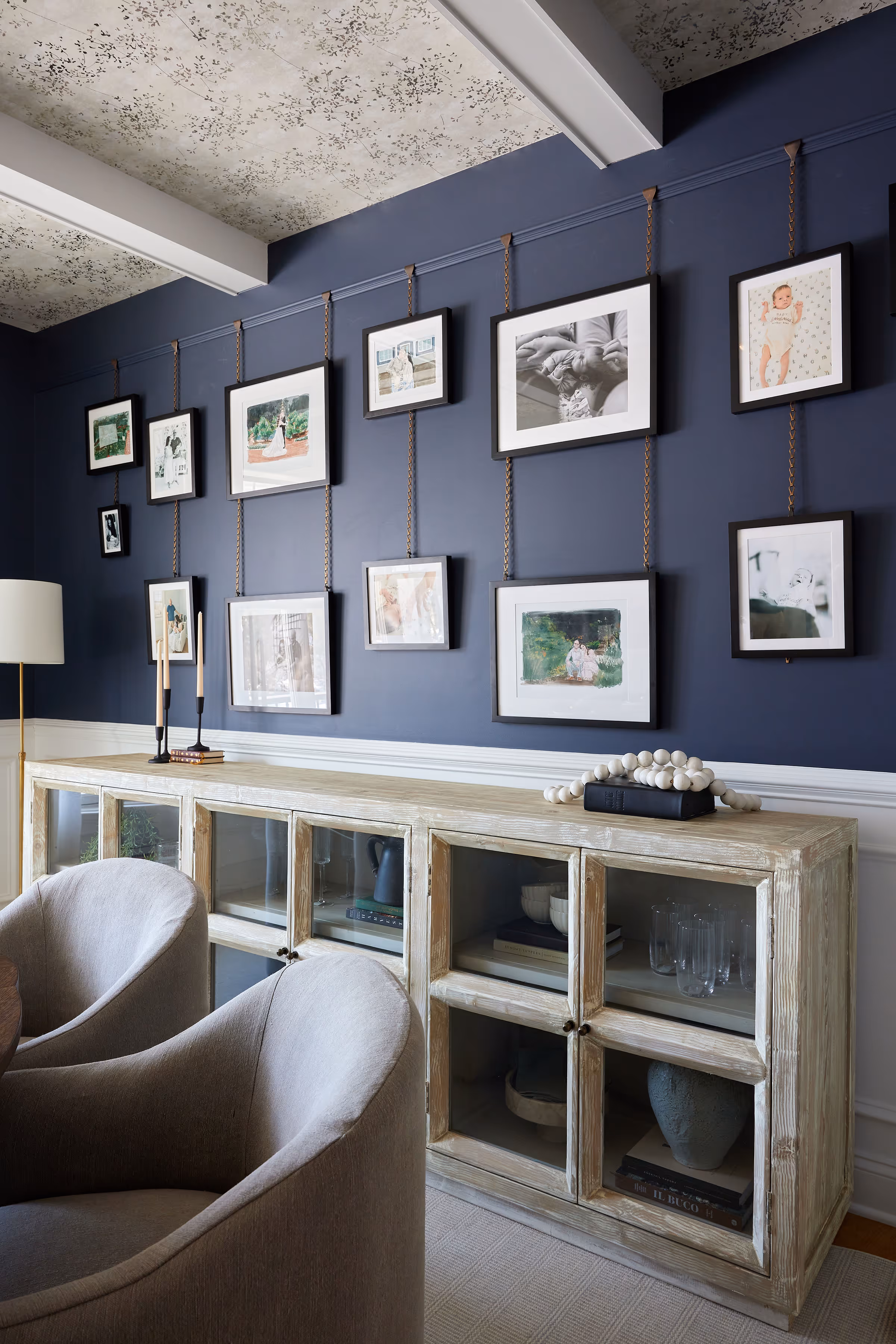 This custom-designed family room and dining room were thoughtfully finished to bring comfort, character, and meaning to every detail. In the living room, built-ins layered with curated family photos and a soft, textural palette set the stage for everyday connection and timeless warmth. Just beyond, the dining room balances sophistication with sentiment, featuring moody navy walls, a gallery of treasured memories, and a statement chandelier that turns shared meals into memorable moments. From cozy textiles to custom millwork, every layer was designed to reflect the people who call this house home.