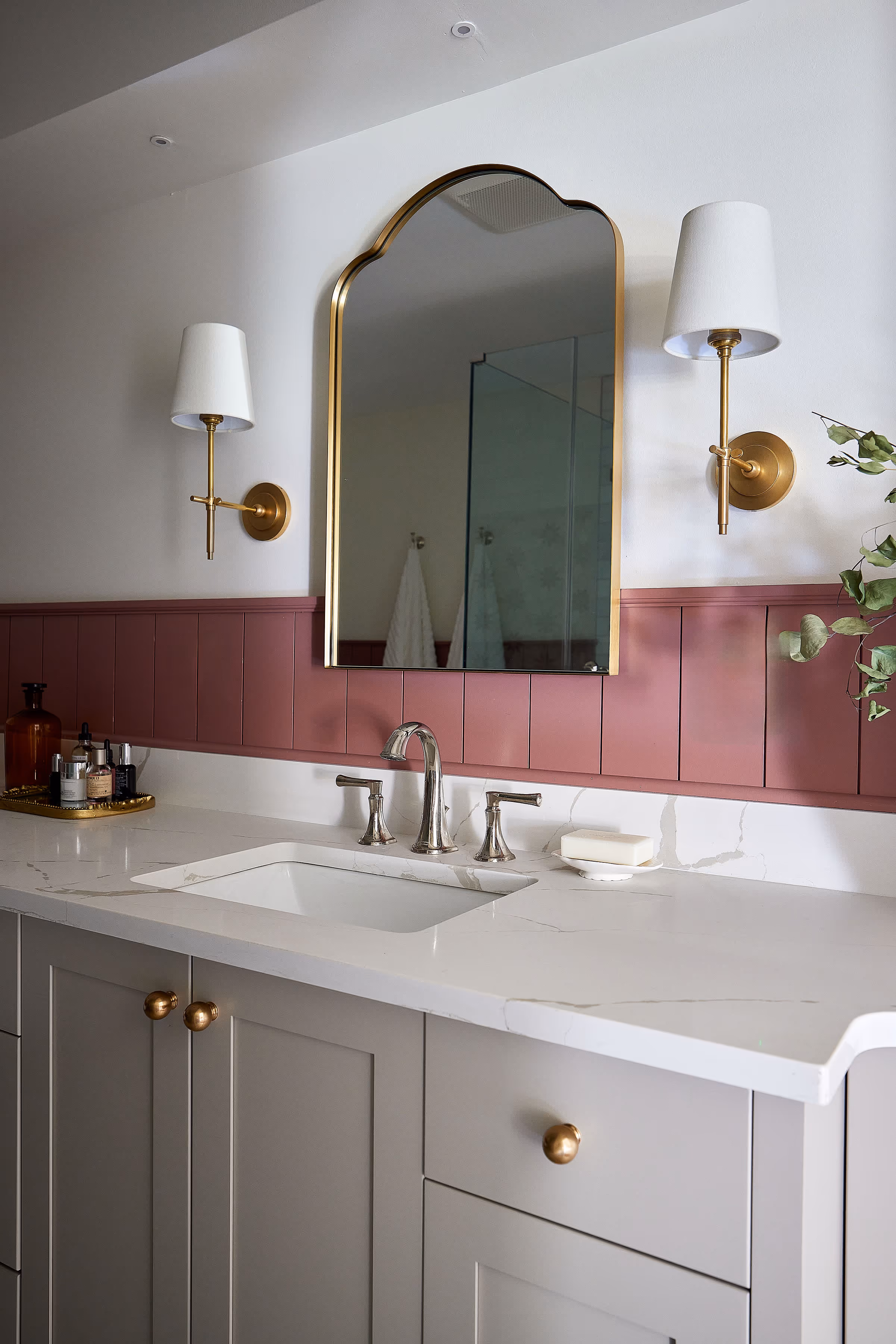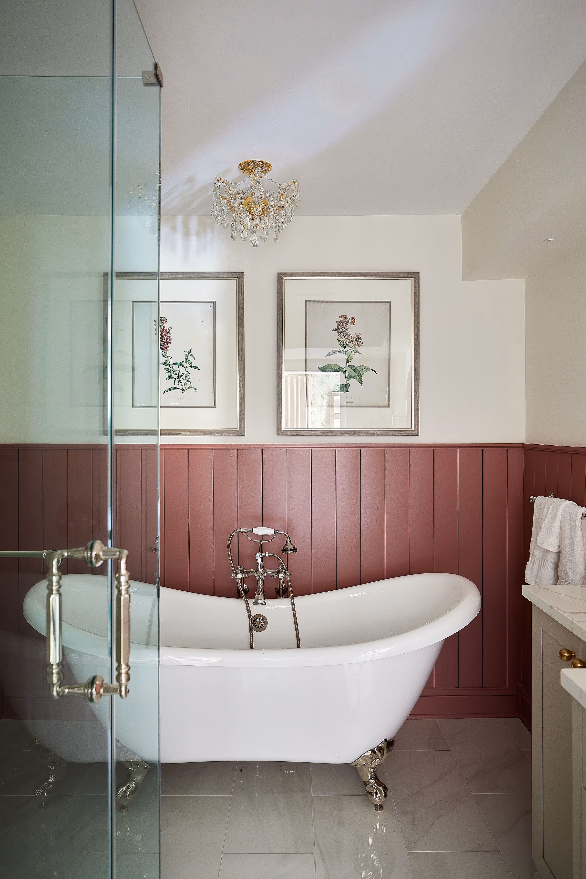 Every detail in this ensuite primary bathroom was thoughtfully chosen to reflect the clients’ love of classic charm and custom character. From the clawfoot tub and mauve wainscoting to the handmade tilework and gold fixtures, this space balances warmth with sophistication. Designed as a seamless complement to an already-finished bedroom, it’s a celebration of both design unity and individuality — one room flowing gracefully into the next.