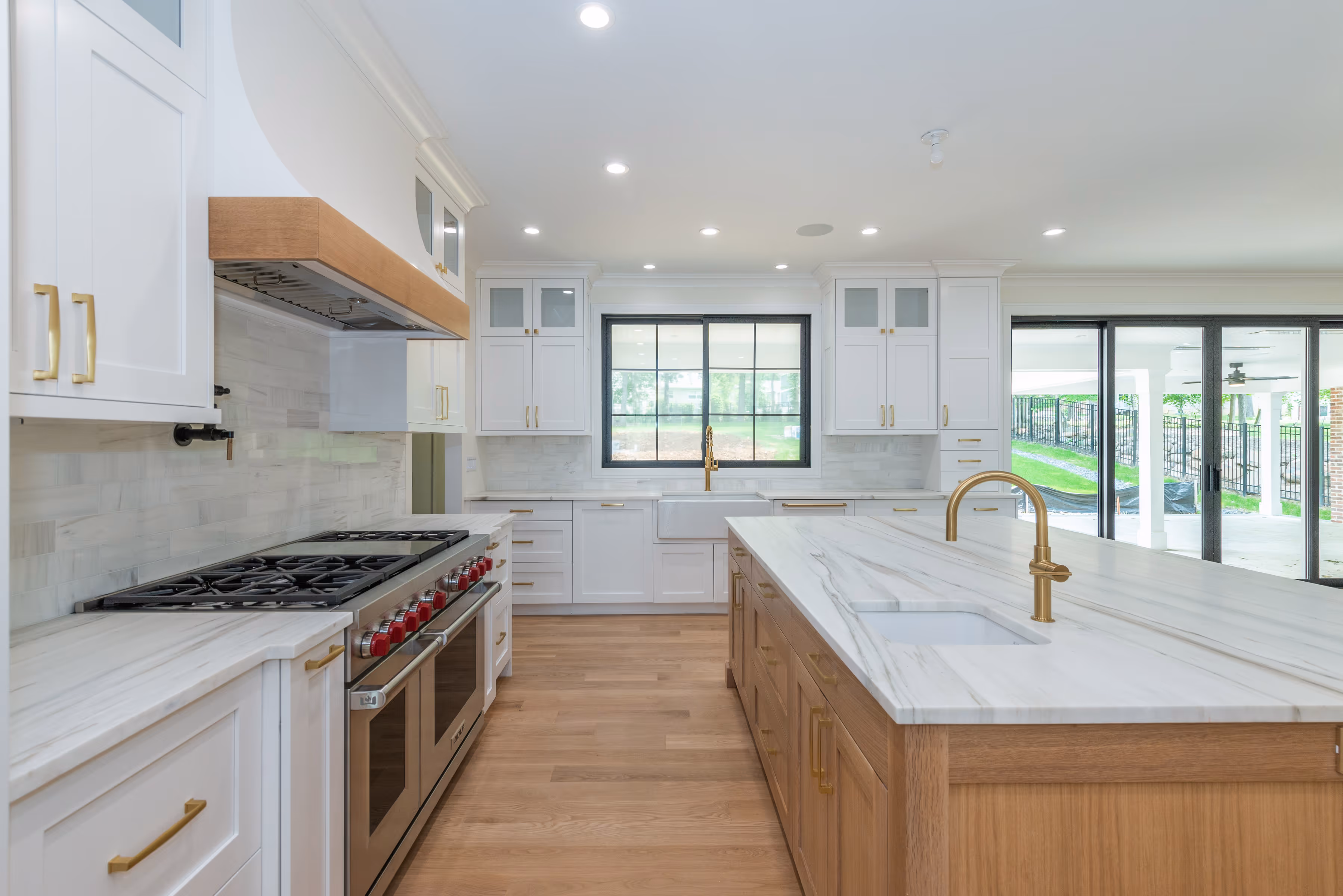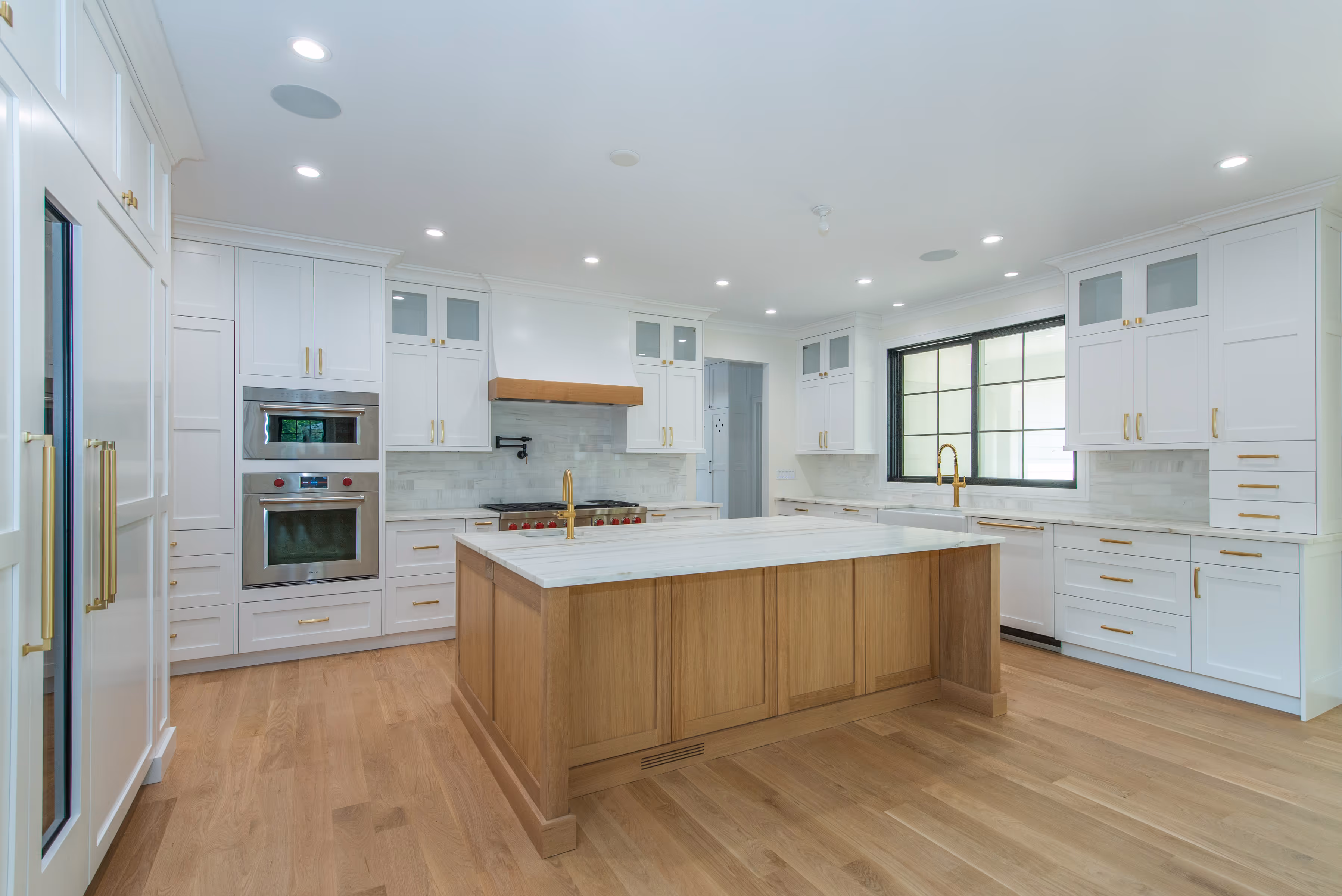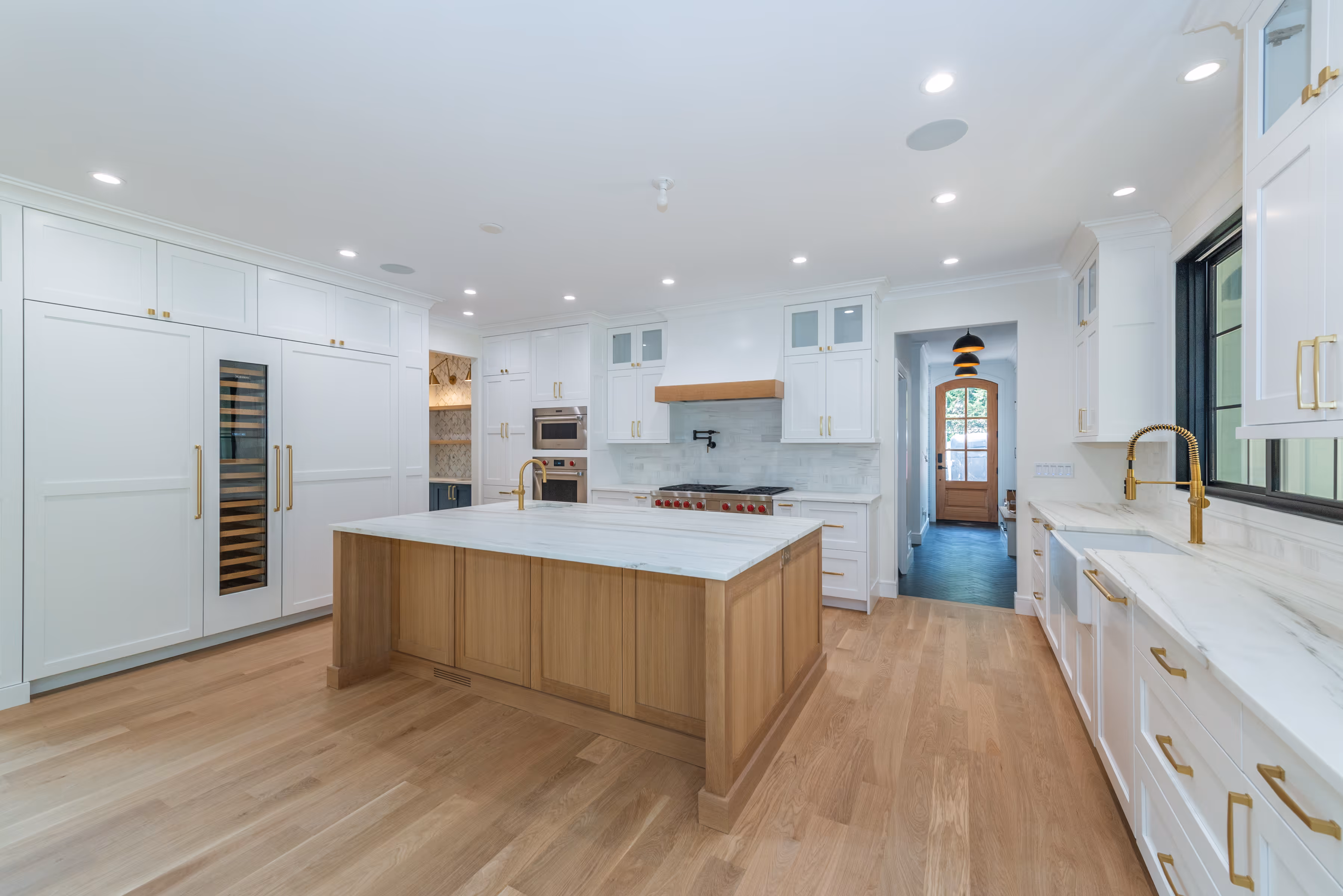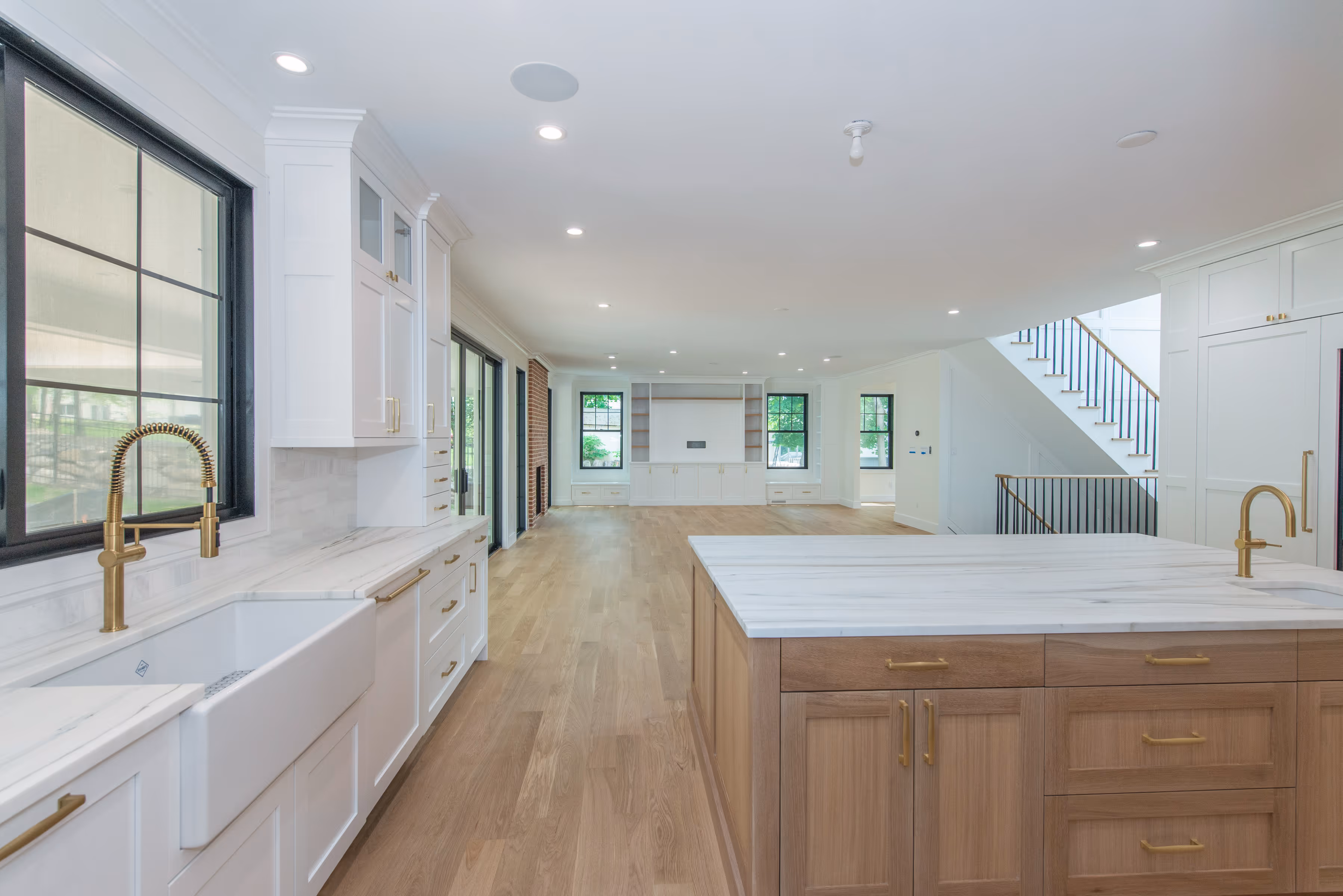 This kitchen is the heart of an open-concept custom home, grounded in intentional design and layered luxury. Clean white cabinetry, brushed brass fixtures, and a generous natural oak island are bathed in light from oversized windows and wide-open sightlines. From hidden panel appliances to a statement countertop, every element balances form and function, creating a space that feels refined, airy, and completely custom.